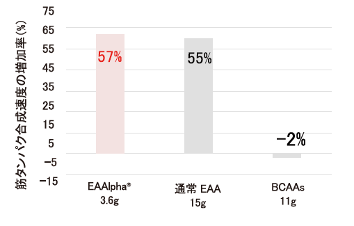 EAAlpha®は26の臨床試験を元に開発されており、3.6gという少量で他組成のEAA15gと同等以上の効果があることが明らかになっています。 *同一試験での比較ではなく、別の同指標測定文献を引用