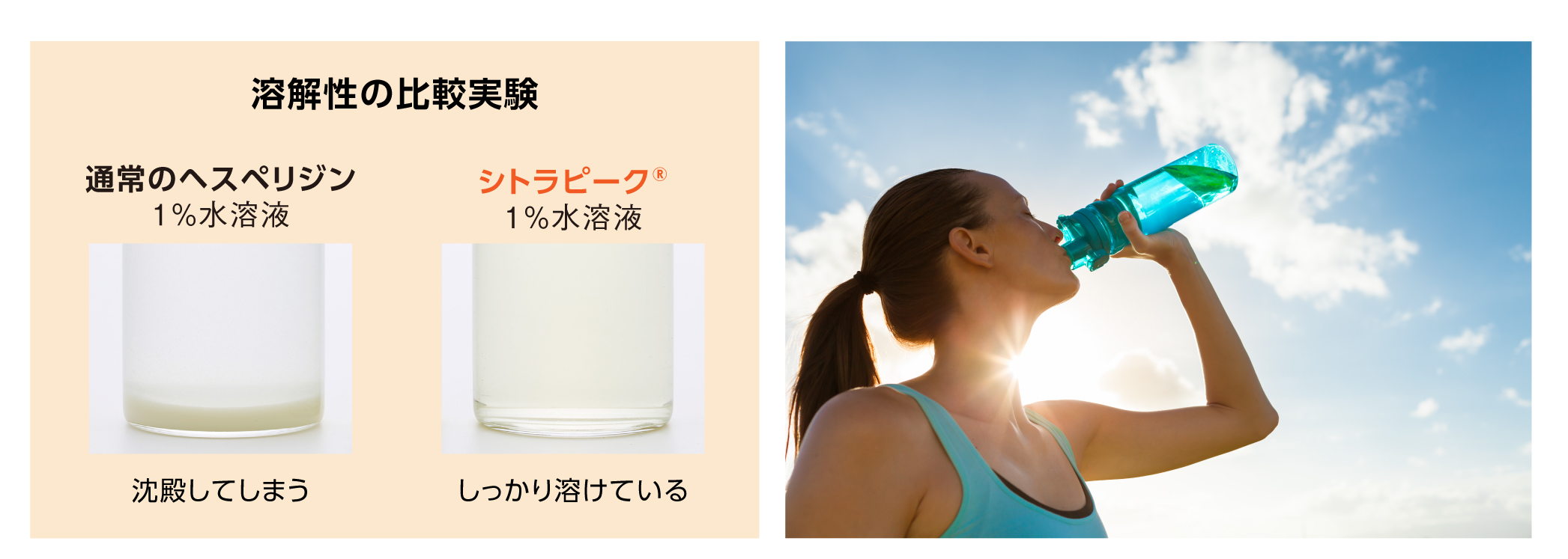 シトラピーク®は通常のヘスペリジンと比較して、溶解性(溶けやすさ)は約10万倍。
