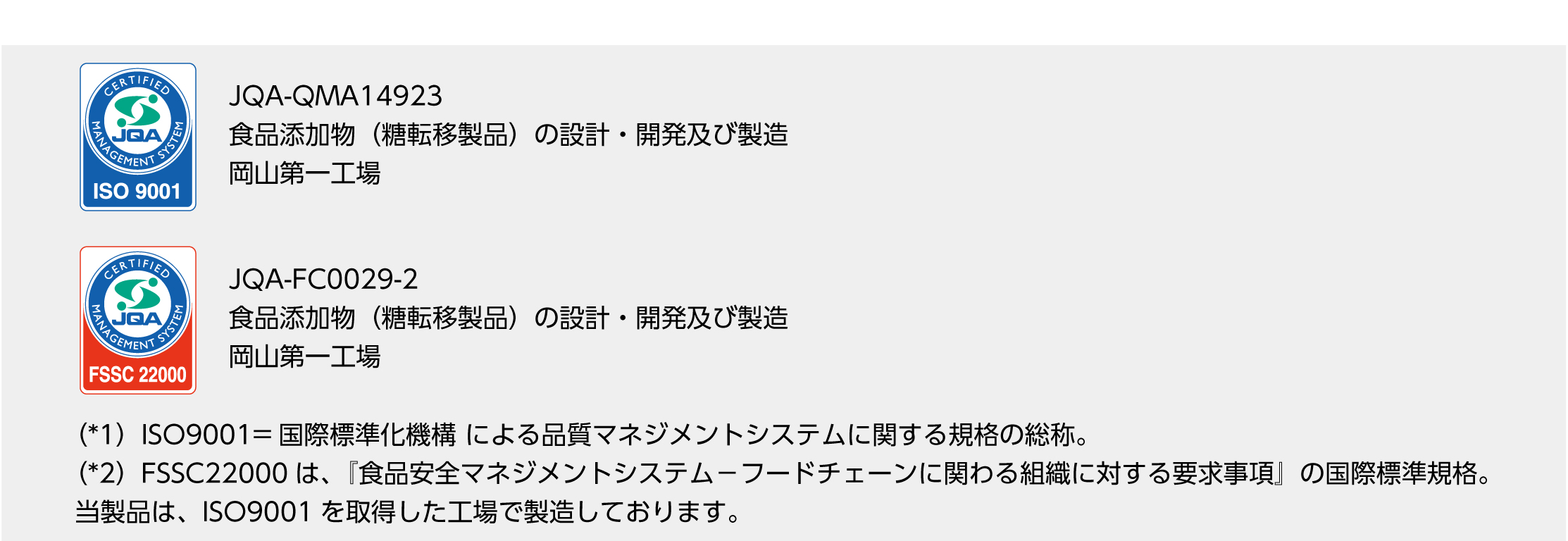 シトラピーク®は、ISO9001(*1)、FSSC22000(*2)を取得した工場で高い品質管理のもと製造しています。