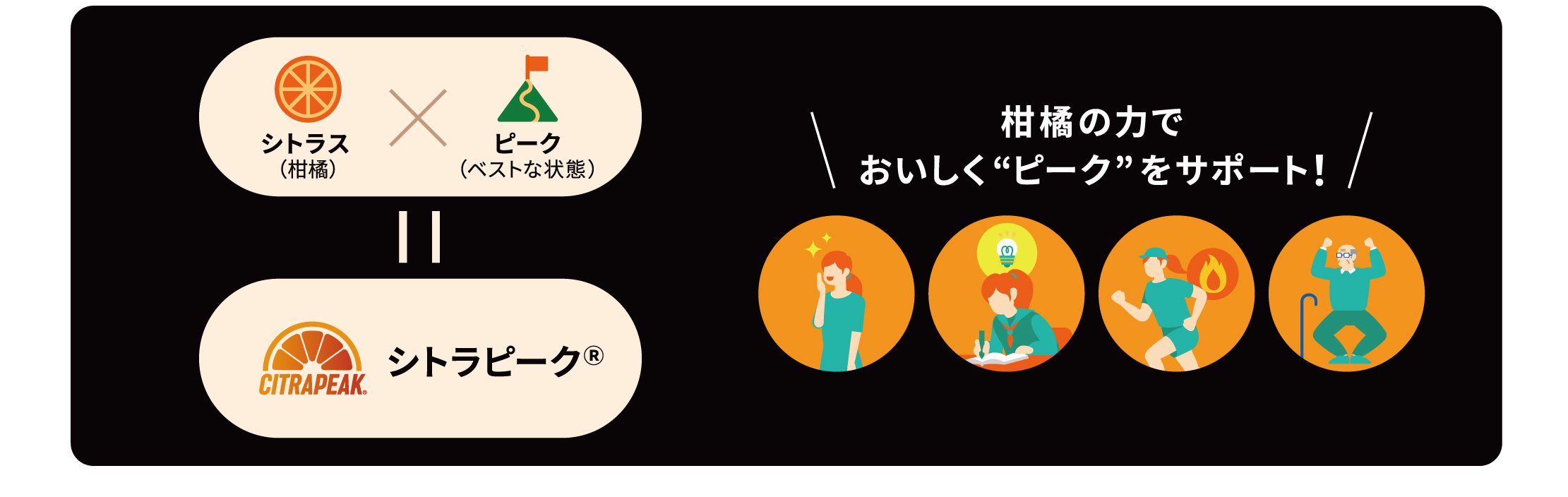 「柑橘の力でみなさまが“ピーク”でいることをサポートしたい」という願いを込めて「シトラピーク®」と名づけており、スポーツ時にも、柑橘の力でベストな状態をサポートし、限界にチャレンジするあなたを応援します!
